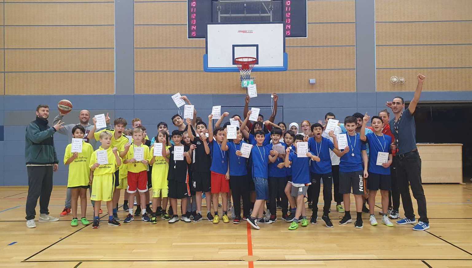 Ein Highlight wartete noch vor der Siegerehrung - der “Shooting Star”- Wettbewerb. Alle Kinder konnten teilnehmen und hatten in der Vorrunde fünf Würfe. Wer drei oder mehr Treffer im Korb versenkte, kam in die Finalrunde. Insgesamt schafften es von den über 30 Schüler:innen sieben ins Finale. Alle übrigen Kinder bildeten einen Kessel um einen der Körbe und die Finalisten wurden mit Applaus in der “Arena” begrüßt. Da stieg der mentale Druck nochmals. Jeder erhielt drei weitere Würfe. Drei Kinder schafften eine 100% Trefferquote und gingen ins Stechen. “Due or Die” war das Motto, entweder du triffst oder bist raus. Die Kids bewiesen Nervenstärke und erst nach zwei weiteren Runden standen die Platzierungen fest.