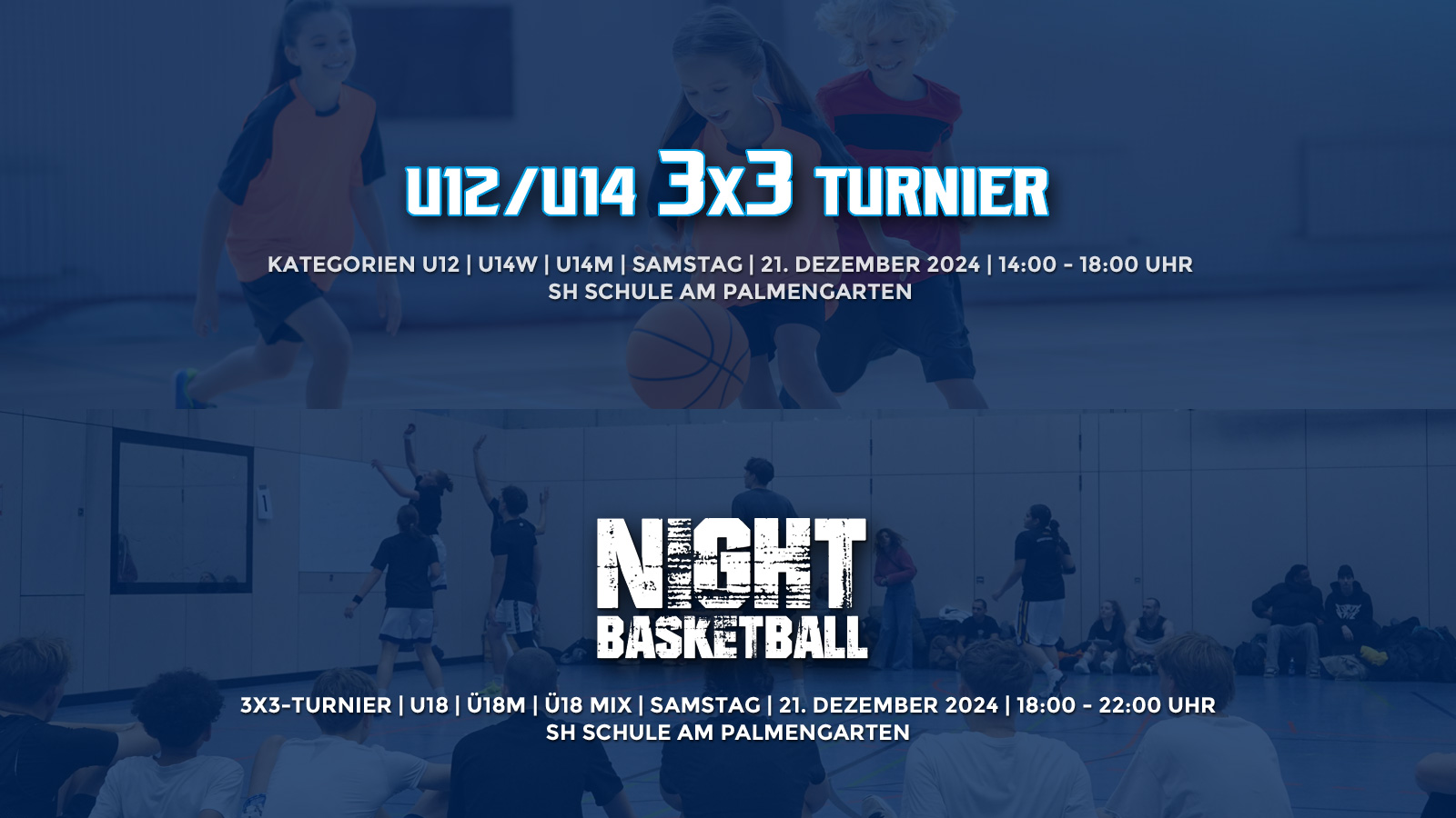 Am 21. Dezember 2024 laden wir euch noch einmal herzlich zu zwei 3x3-Turnieren ein. Am Nachmittag zwischen 14 und 18 Uhr machen wir ein Turnier nur für U12- und U14-Kinder. In der Kategorie U12 können gemischte Teams mitspielen. Für die U14 teilen wir zwei Kategorien ein, Mädchen und Jungs.