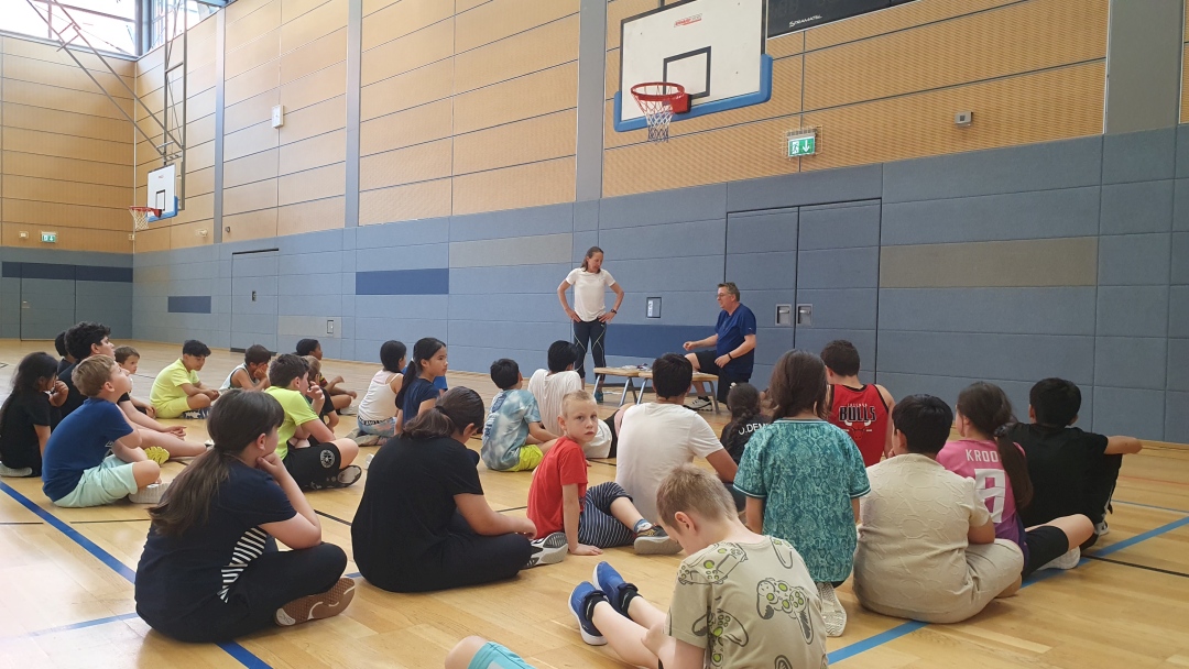 Zum einen wurde im Rahmen des Turniers die Riegenwertung vorgenommen – eine feierliche Team-Ehrung für den Einsatz und die Leistungen während des GTA-Kurses. Zum anderen stand ein echtes Highlight auf dem Programm: Die Verleihung der Basketballabzeichen des Deutschen Basketball Bundes (DBB)! Viele der Kinder hatten in den Wochen zuvor fleißig trainiert und sich ihr Abzeichen redlich verdient.